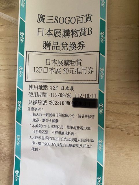 物品名稱:廣三SOGO日本展抵用券