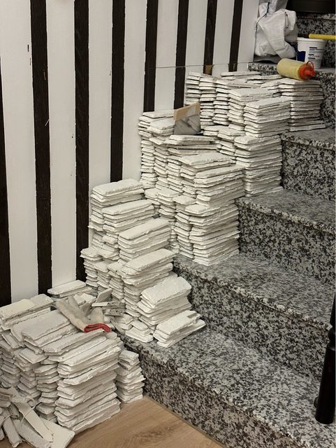 的文化石裝箱,總共約575片白色文化石。