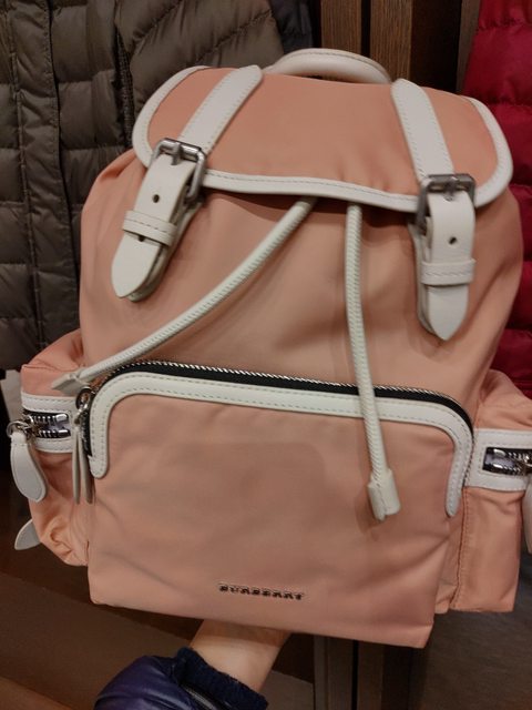 4.BURBERRY 經典銀色品牌LOGO尼龍滾邊後背包(中-粉紅) 18999元