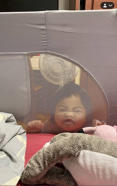 友中間方便夜奶躺餵,但自從她會翻身滾來滾去摔好幾次後,就上網入手了這組床欄(當初