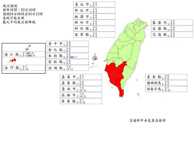 報後表示,台南位處背風面,各單位務必趁風雨尚不明顯時