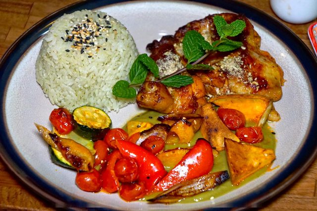 的香料和醬汁淋在軟嫩的雞腿上,與蔬菜一同烘烤,再沾上特製的花椰醬,香氣四溢,令