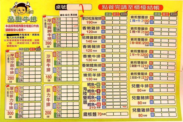 品廚牛排的菜單上標榜使用紐西蘭進口的優質牛肉,未點餐者需支付20元的共餐費。所有