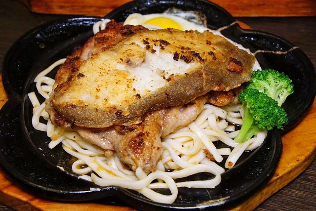 海陸雙層(鱈魚加雞腿),由鱈魚排搭配了雞腿排的大份量排餐組合。