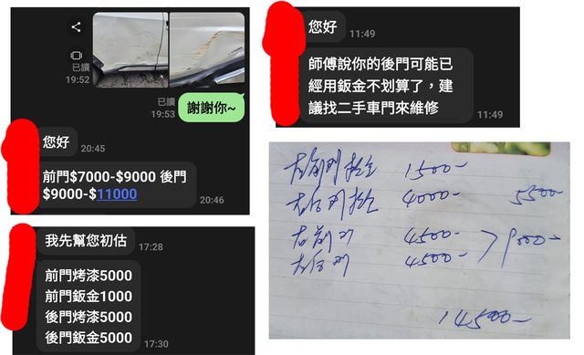 我的狀況前後兩門鈑金+烤漆,報價在18000元~12000元之間