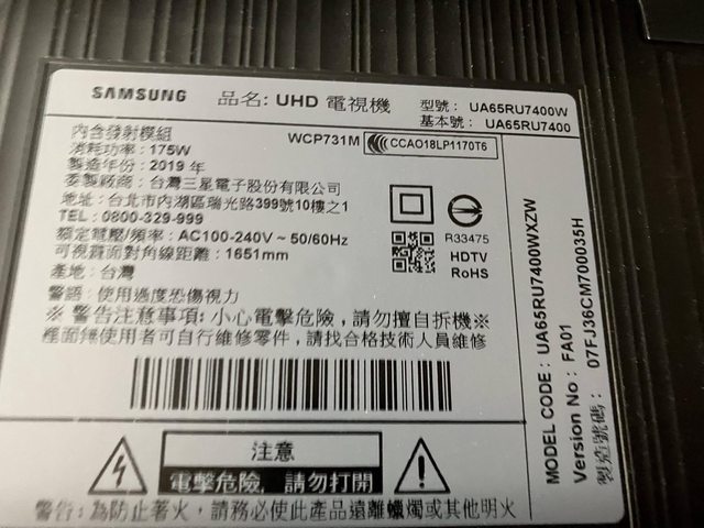 三星65吋電視,2019購,使用正常,型號請見照片,需自行搬運,售價$12500,請站內後加line,,誠可小議,謝謝台南板。