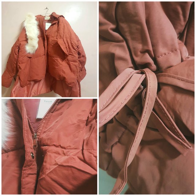 1.前短後長保暖的鋪棉外套,剪裁修身,袖口有抽繩設計,附可拆式毛領,拉鍊、鈕釦二