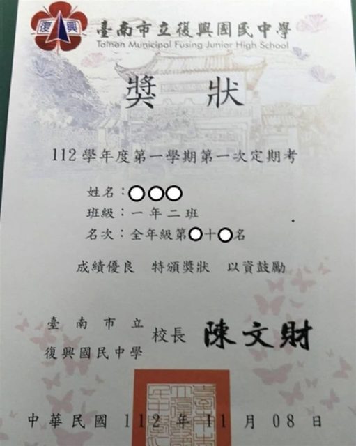 台南復興國中獎狀印排名 教部要求縣市落實督導