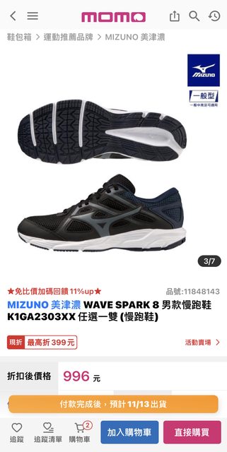11/4 MOMO下單11/8到貨,全新僅在家試穿一次,因想換寬楦故求售,原價996 欲售900,意