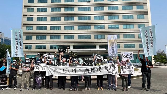 反龍科擴建自救會今天號召約30多位民眾,上午前往竹科管理局陳情抗議。記者黃羿馨/