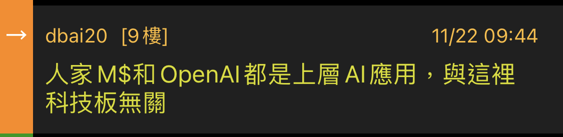 → dbai20 : 人家M$和OpenAI都是上層AI應用,與這裡科技板無關 11/22 09:44