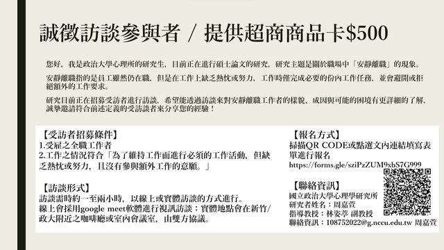 研究目前正在招募受訪者進行訪談,希望能透過訪談來對安靜離職工作者的樣貌、成因與