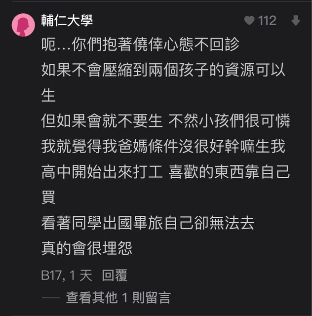 噓 chy19890517 : 小孩不能選擇出生阿,有本事生就要223.137.196.103 09/16 00:27