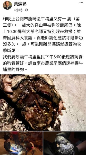晚又發現1隻穿山甲尾巴疑遭遊蕩犬咬斷一截,通報後送往屏科大野生動物收容中心救治