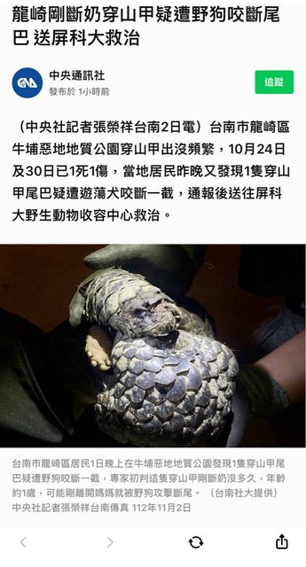 龍崎剛斷奶穿山甲疑遭野狗咬斷尾巴 送屏科大救治