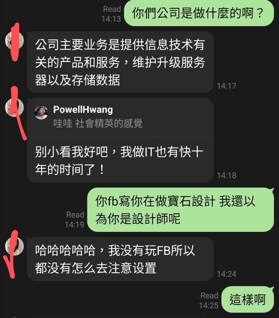 3.她FB上原本說是新加坡大學金融系畢業然後在做珠寶設計結果跟我說在做IT明顯沒跟到人設而且我講了之後馬上改