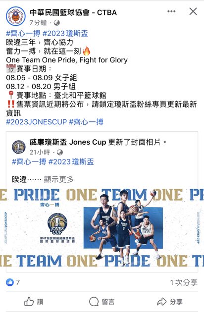 : 籃協粉專也分享了已開設的瓊斯盃FB粉專