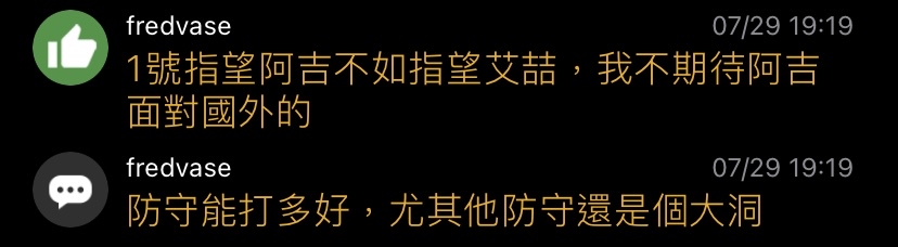 → Goatrae : 狀態調得滿快的 不過下半場有撞到一下 希望沒事 07/29 21:42