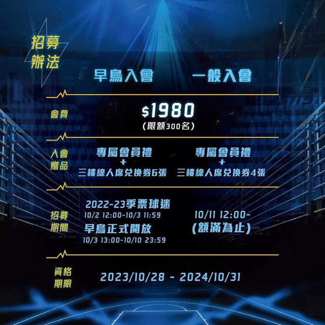 .10/2(一)12:00 - 10/3(二)11:59:2022-23季票球迷優先報名早鳥(購票時須輸入季票會員身份證字號驗證)