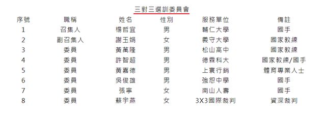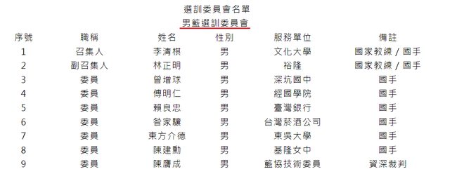 教練等人,將彙整後的名單提交至男籃選訓委員會討論,經過選訓委員針對名單內的教練