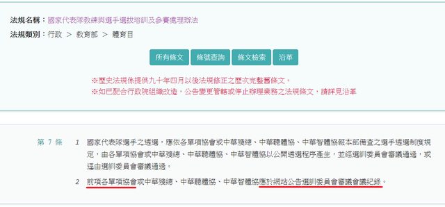 〈國家代表隊教練與選手選拔培訓及參賽處理辦法〉第7條要求於網站公告選訓委員會審