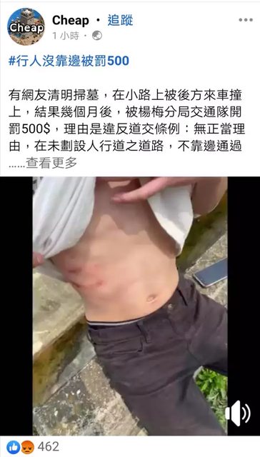 桃園市一名網友今年清明節步行掃墓被撞受傷、還挨罰500元,最近收到罰單,百萬網紅