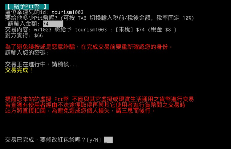 推 YCL13 : 收到的紅包已返回,至於系統吃掉的稅我就沒辧法了 10/11 20:07