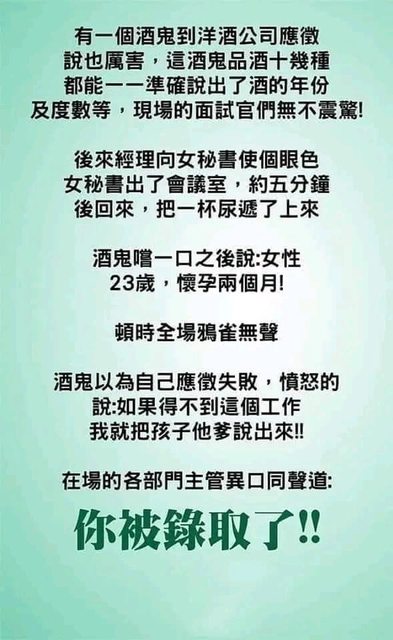 接著老總示意秘書端出自己的尿,酒鬼喝了一口便說:糖! 糖! 糖!