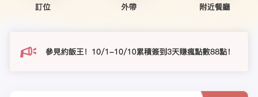 王品瘋美食App 參見大王 簽到3天送點數 活動時間(可參加簽到的時間): 2024/10/01 0:00 ~ 2024/10/10 23:59 完成簽到活動,連續3天簽到,就可兌換瘋點數88點! 徽章換禮物時間: 2024/10/11 00:00 ~ 2024/10/17 23:59 https://lurl.cc/XTQ3be https://i.imgur.com/54iwUDz.jpeg