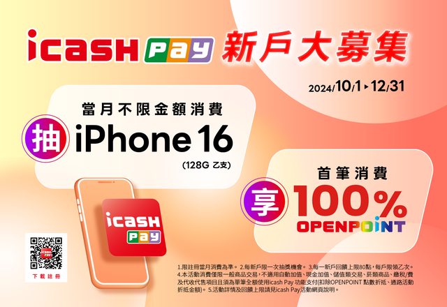 icash Pay新戶大募集,月月抽iPhone16,再贈100%回饋
