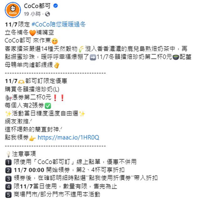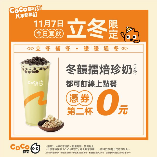 標題[情報] CoCo都可 11/7冬韻擂焙珍奶買一送一