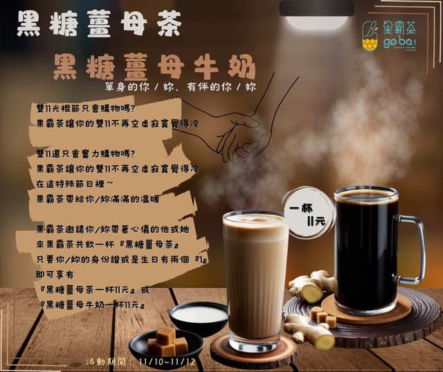 優惠 : 黑糖薑母茶或黑糖薑母牛奶一杯11元