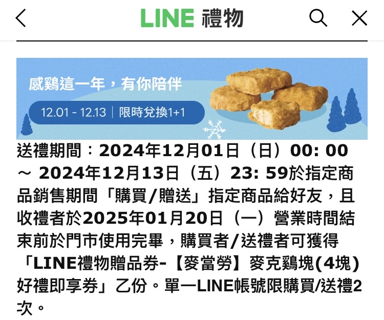 推 ilw4e: 麥當勞APP不是每周都有雞塊1+1嗎 27.247.36.117 12/01 00:31
