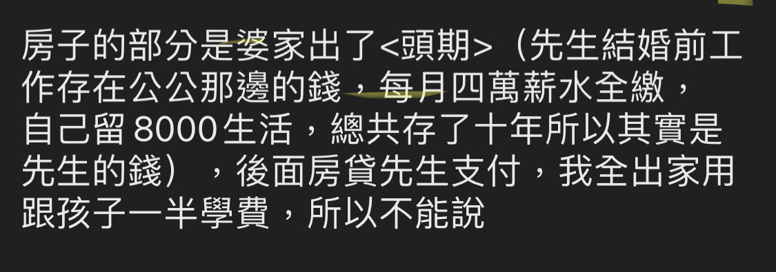 → ytwu : 溫鼕提醒,扣掉房貸後先生剩餘薪資跟她是一樣的 02/24 12:40