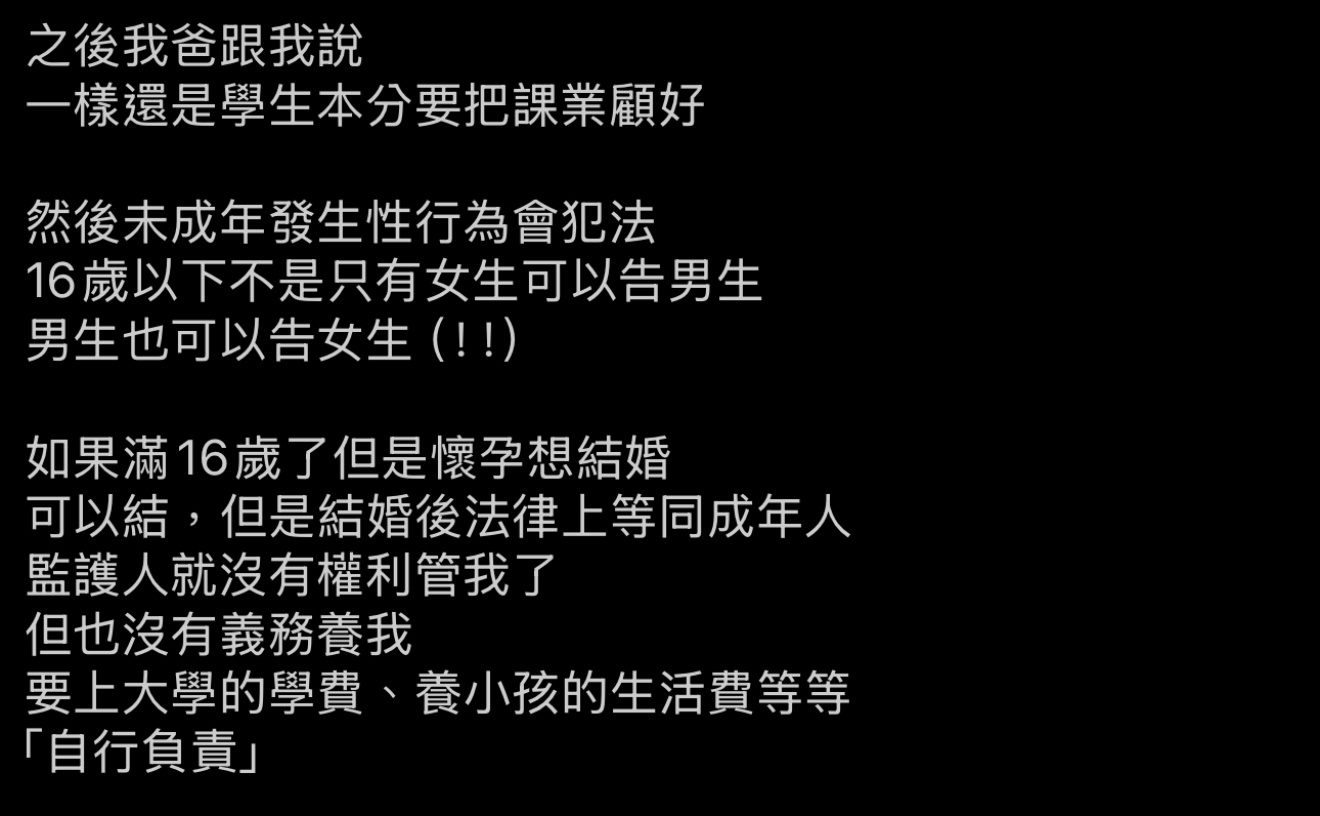 → AppleAlice : 而且這篇的爸爸說的也沒錯,滿16歲可以結婚,但法律 04/15 22:06