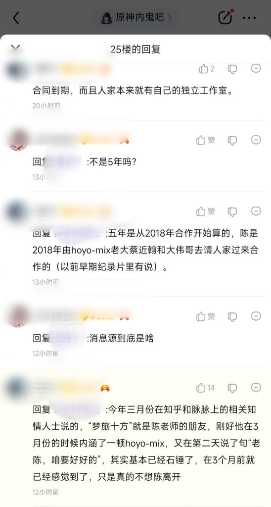 此為小道消息,並無證據 此推測由來 1.3.8專輯的作曲者中完全沒有陳致逸的名字,以前原神的曲目約有9成都是陳先生擔當作曲 2.足跡PV中使用的楓丹曲目(陳致逸先生創作)在楓丹實裝後並沒有採用 雖然說作品擔當的作曲家換人是家常便飯, 但當初足跡PV那曲聽不到完整版還是挺可惜的。 -- ※ 發信站: 批踢踢實業坊(web-ptt.tw), 來自: 125.228.240.49 (臺灣) ※ 文章網址: https://web-ptt.tw/miHoYo/M.1692340495.A.A20