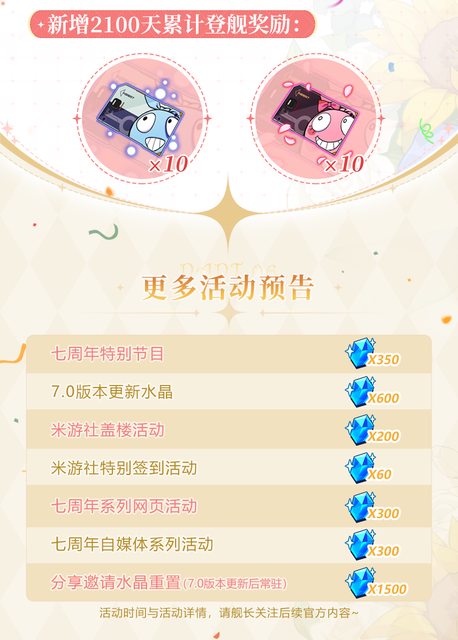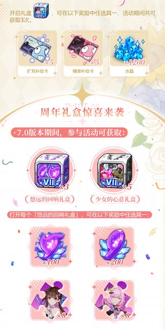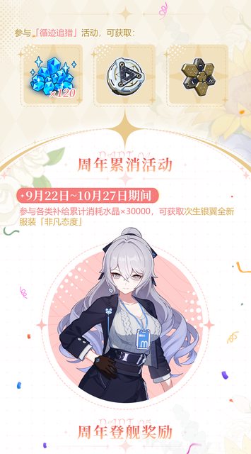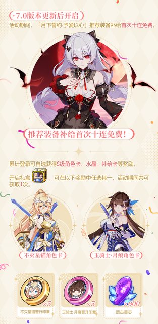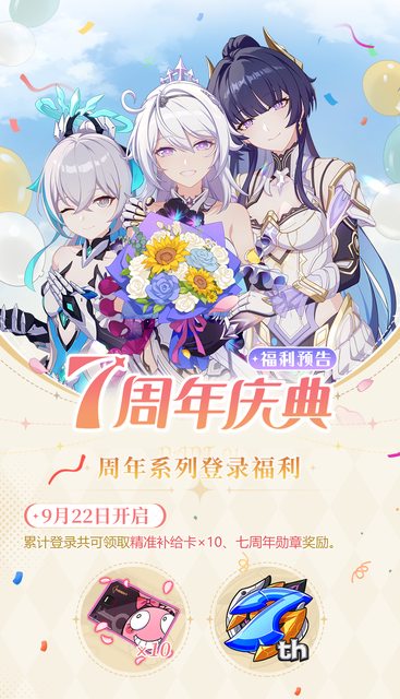 講一些除了送補給卡之外比較重要的: (其他服沒意外會拔一些獎勵到各自的週年慶活動) 大月下的精準有送一次免費10連 送星錨/月痕的角色卡or晉升印章 星錨的新造型是活動免費拿的,主線有一個芽衣聖痕 大鴨鴨的造型是累消拿的,會在6.9版本末開 -- ※ 發信站: 批踢踢實業坊(web-ptt.tw), 來自: 223.26.108.44 (臺灣) ※ 文章網址: https://web-ptt.tw/miHoYo/M.1694092537.A.CE6