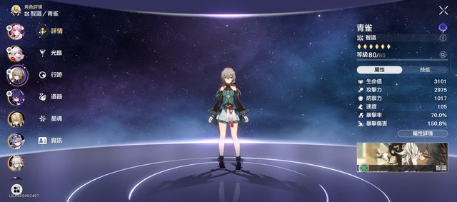 6+1青雀,行跡6/8/8,四量子和繁星,因為還蠻喜歡青雀的,官方又一直在符玄的影片讓她