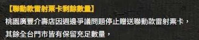感謝開拓者們對星選美味指南熱情支援,經合作品牌通知,桃園廣豐介壽店即日起因故停止贈送聯動款雷射票卡,請開拓者前往時留意。 活動將持續在起家雞全台共50家門市,包含8家內用外帶專門店,以及42家外送外帶專門店熱烈進行中。 https://reurl.cc/z65WkQ 廣豐店起爭議? 以下圖片轉自巴哈 http://i.imgur.com/lkAPQz7.jpg