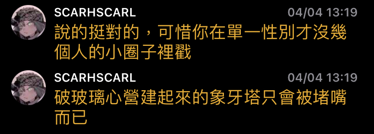 → archerhole: 你形容的只是單純的黑粉吧 吵架需要一來一往 大多伴隨 04/09 01:18