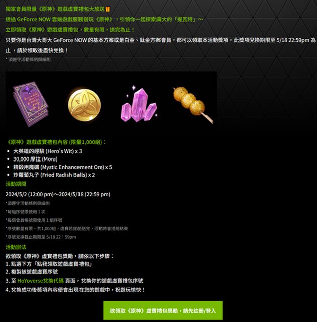 如果你是用GFN玩原神的人 到5/18晚上11點前 都可以去GFN的原神活動官網拿虛寶序號 https://gfn.taiwanmobile.com/portal/event/genshinreward2024 但是要去米哈遊的代碼兌換頁面才可以換 只有1,000組,要領要快 雖然都是一些小東西,但不無小補 反正現在用GFN玩原神有夠方便,改版還不用一直更新 畫質好又不用擔心手機容量炸掉,也不會有過熱的問題 沒有要吹,但對我來說真的蠻好用的 本來就有會員身分的就可以拿虛寶 https://i.imgur.com/pplOQzN.png