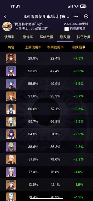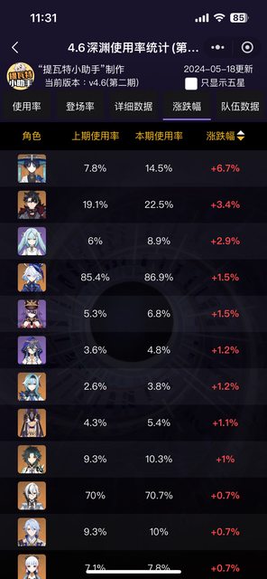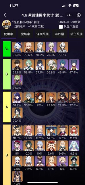 目前主流依然是龍王僕人各自一路 S+跟第一期使用率相比基本沒有什麼變化,鐘離雖然掉到S但其實也差不到1% 值得一提的事這次有效樣本只有上次的一半,上次14萬份,這次7萬 然後可以注意到的是跌幅最大的胡桃跟香菱,大概就是代表第一期的BUFF給的真的很多 我這期用胡桃確實就慢了不少 然後僕人持有率達到50% -- ※ 發信站: 批踢踢實業坊(web-ptt.tw), 來自: 36.239.219.238 (臺灣) ※ 文章網址: https://web-ptt.tw/miHoYo/M.1716003688.A.683