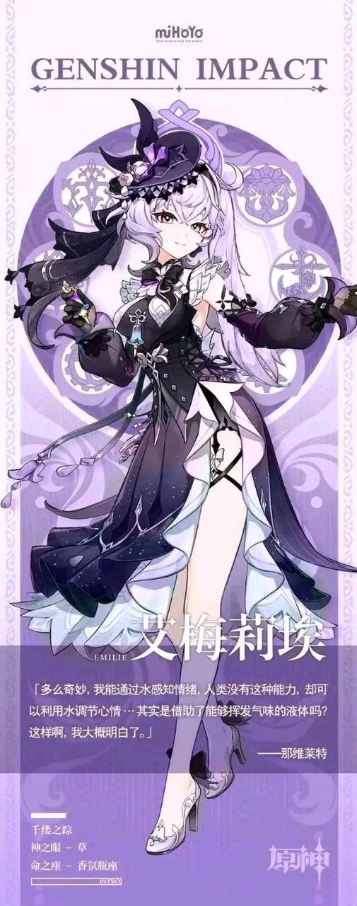 艾梅莉埃 ‧ 千縷之蹤 ▍知名香水設計師 人們對氣味的敏感程度各不相同,但對香氣的喜好傾向卻很相似。 能對世間所有氣味照單全收的人並不多。 那些清新的、芬芳的、怡人的…會經過艾梅莉埃精心調和,最終出現在楓丹廷利奧奈區琳琅 滿目的貨架上。 而那些陳舊的、腐朽的、汙濁的…則會被她悉數抹去,讓一切光潔如初。 或許有人是第一次聽說「現場清理人」這種職業,對其不甚瞭解。 若你有幸與艾梅莉埃結識,可向她詢問一二。她是一個擅於聆聽,也擅於解答的人,一定會 給出令你滿意的答覆。 #原神 #GenshinImpact #HoYoverse #艾梅莉埃 #知名香水設計師 —- 「多麼奇妙,我能透過水感知情緒,而人類沒有這種能力,卻可以利用水調節心情…其實是 藉助了能夠揮發氣味的液體嗎?這樣啊,我大概明白了。」 ——那維萊特 ◆姓名:艾梅莉埃 ◆稱號:千縷之蹤 ◆知名香水設計師 ◆神之眼:草 ◆命之座:香氛瓶座 #原神 #GenshinImpact #HoYoverse #艾梅莉埃 #知名香水設計師 -- ※ 發信站: 批踢踢實業坊(web-ptt.tw), 來自: 42.70.116.148 (臺灣) ※ 文章網址: https://web-ptt.tw/miHoYo/M.1717408855.A.24A