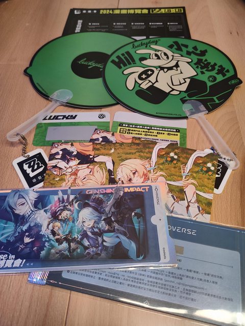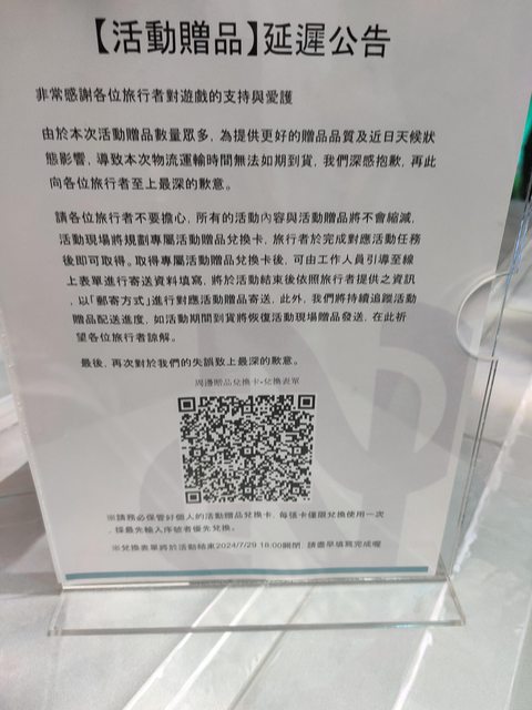 在最內圈紅龍柱引導下,走到有官方Coser凱瑟琳的櫃檯,然後她會面無表情或者臭著一張臉,把一張序號卡給你,然後指著旁邊桌上的小板子,上面寫贈品缺,事後郵寄: