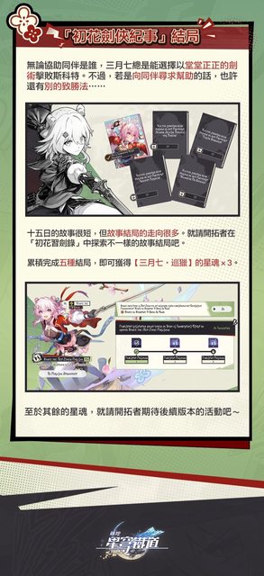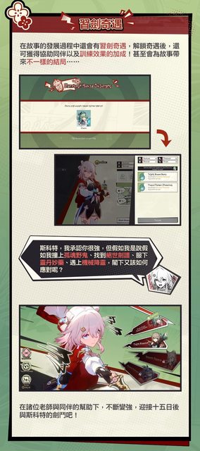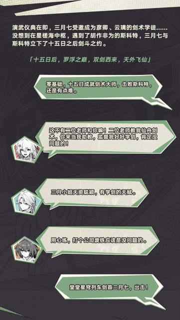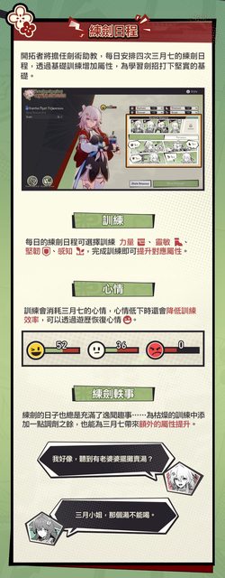 演武儀典在即,三月七受邀成為彥卿、雲璃的劍術學徒。而你將擔任她的助教,幫助她規劃 練劍日程,取得劍鬥勝利。 https://i.imgur.com/Yl6RQMQ.jpeg