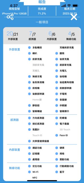 1.功能皆正常,已使用手機醫生檢測如附圖,1-1NFC無Tag無法測,Apple Pay皆正常