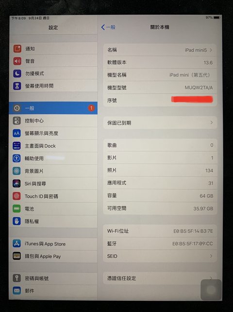 標題[賣/全國/皆可] ipad mini 5 wifi 64G 電池99%