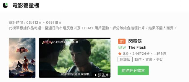 閃電俠上映首週登上LINE TODAY電影聲量榜冠軍