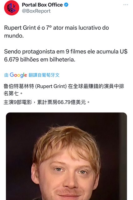 魯伯特葛林特 (Rupert Grint) 在全球最賺錢的演員中排名第七。主演9部電影,累計票