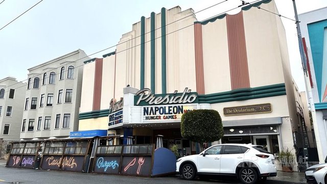 夕陽西下,舊金山普里席狄歐戲院(Presidio Theatre)亮起燈光準備營業,售票處旁的
